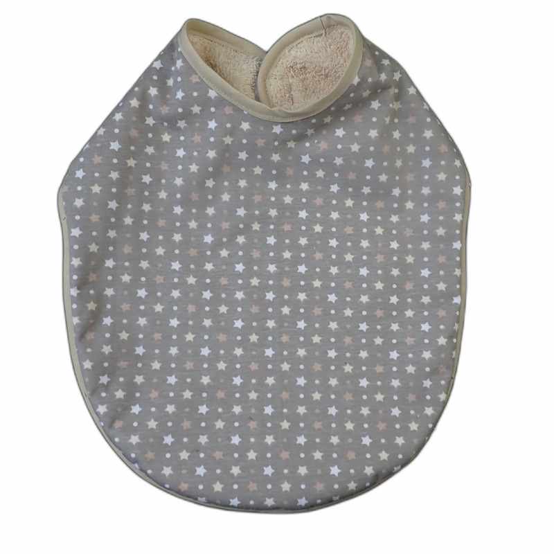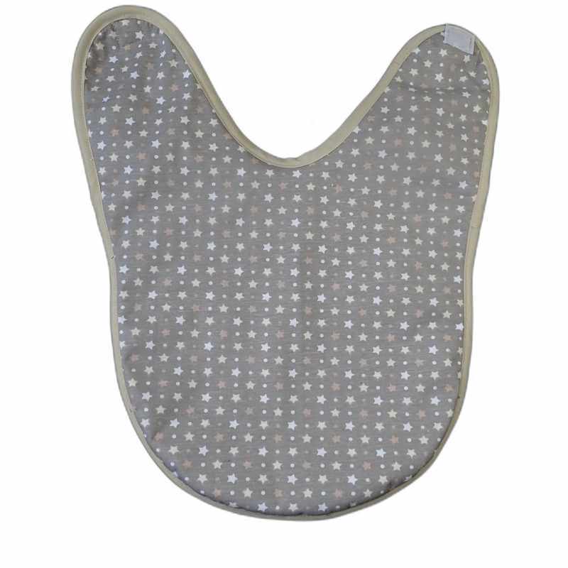 Bavoir imperméable grand format gris et beige motif petites étoiles, doublé d’éponge en coton beige clair, fermé au dos par scratchs.