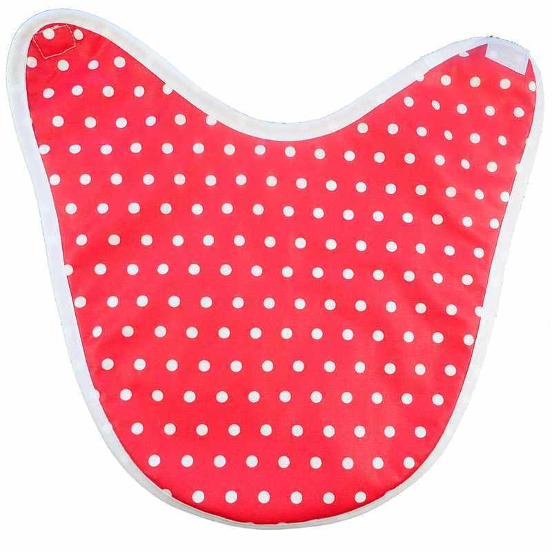 Petit bavoir imperméable rouge motif pois blanc doublé d’éponge en coton blanc, se ferme par deux scratchs et est bordé par un biais blanc. Il est livré dans une pochette en organza.
