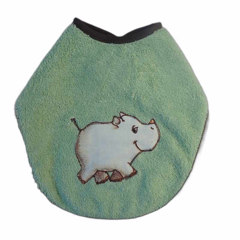 Bavoir en éponge de coton vert petit format, décoré d’un motif rhinocéros, il se ferme au dos par scratchs.