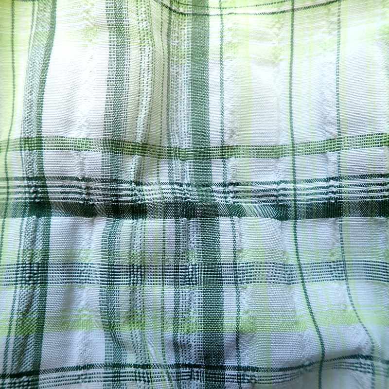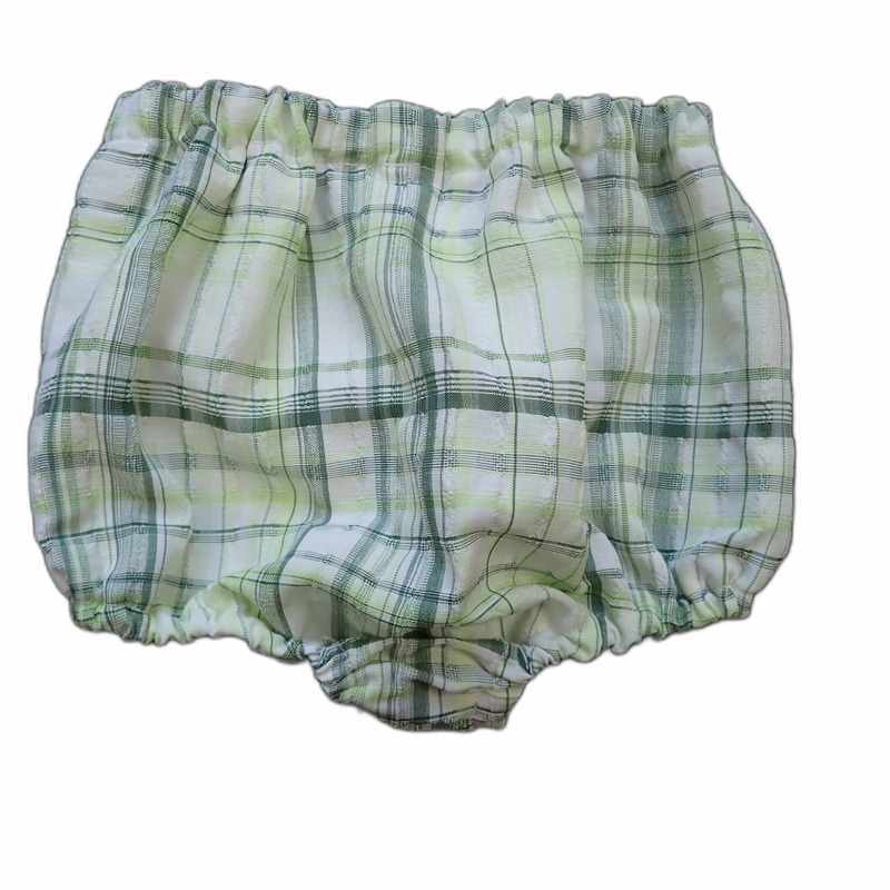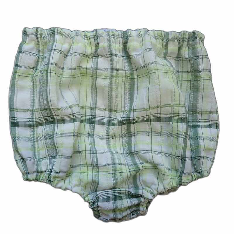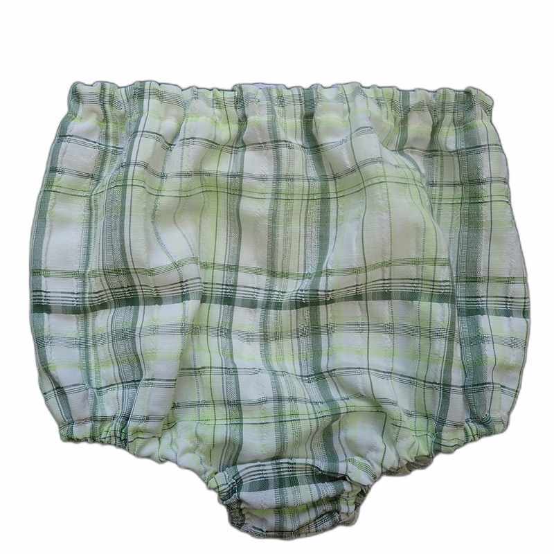 Bloomer bébé en coton et viscose légèrement gaufré avec des grands carreaux ivoires et verts, élastiqué à la taille ainsi qu’aux cuisses. Le modèle est pratique et confortable, idéal pour les beaux jours, il est livré dans une pochette en organza.