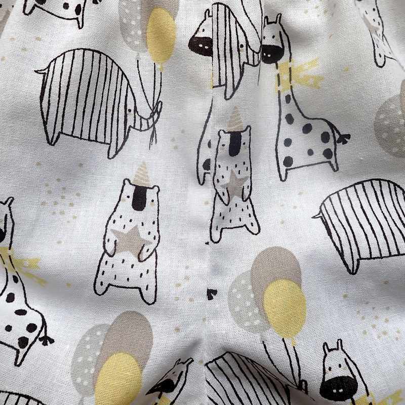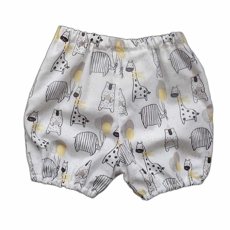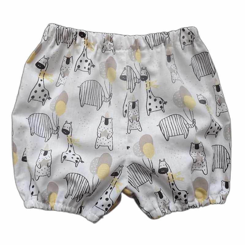Bloomer bébé en coton blanc motif éléphants et girafes noirs et jaunes, élastiqué à la taille ainsi qu’aux cuisses. Modèle pratique et confortable, idéal pour les beaux jours livré dans une pochette en organza.