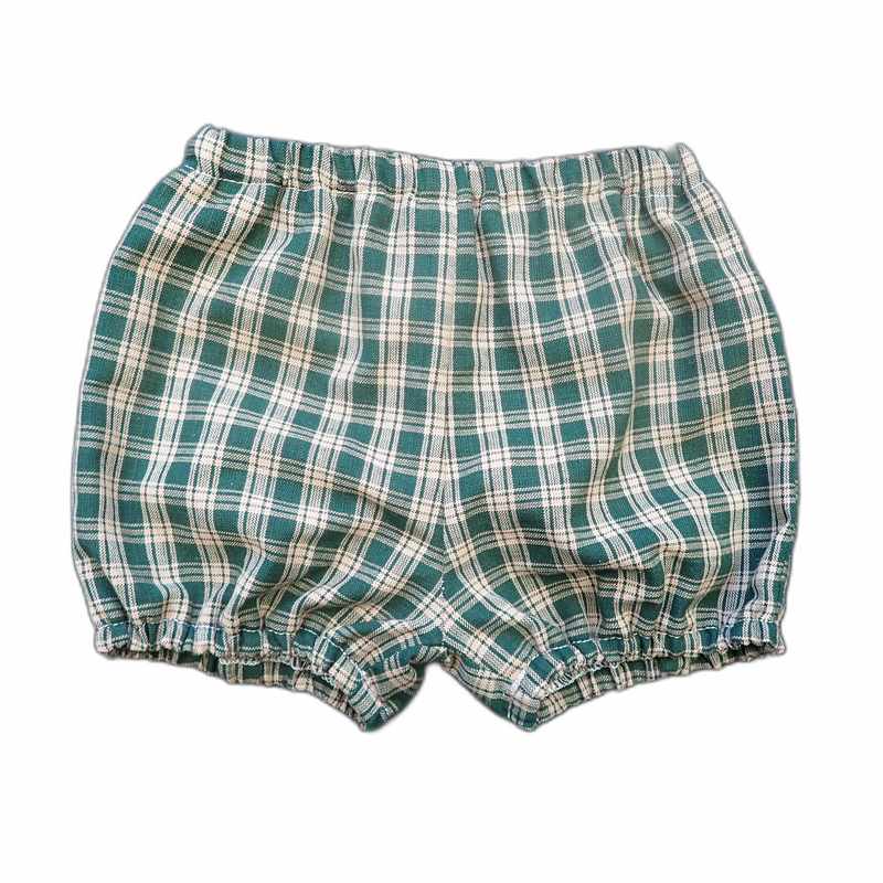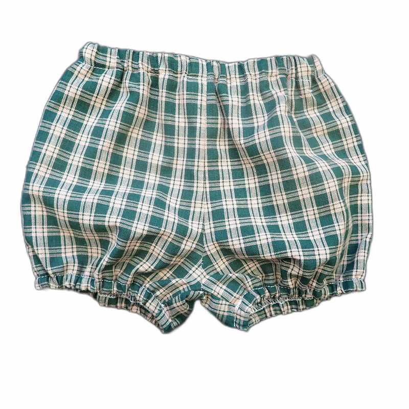 Bloomer bébé en coton vert et beige à carreaux, élastiquée à la taille ainsi qu’aux cuisses. Modèle pratique et confortable, idéal pour les beaux jours, livré dans une pochette en organza.