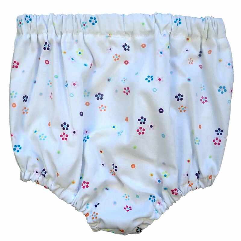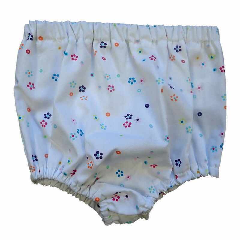 Bloomer en coton blanc imprimé petites fleurs multicolores, élastiqué à la taille et aux cuisses. Le modèle est livré dans une pochette en organza.