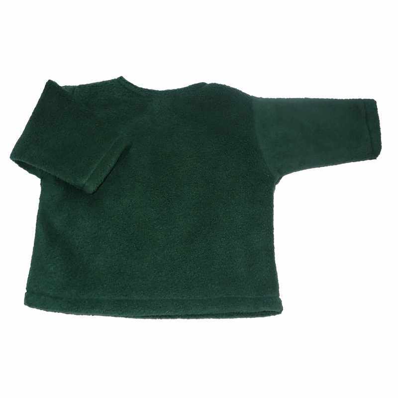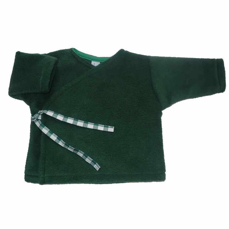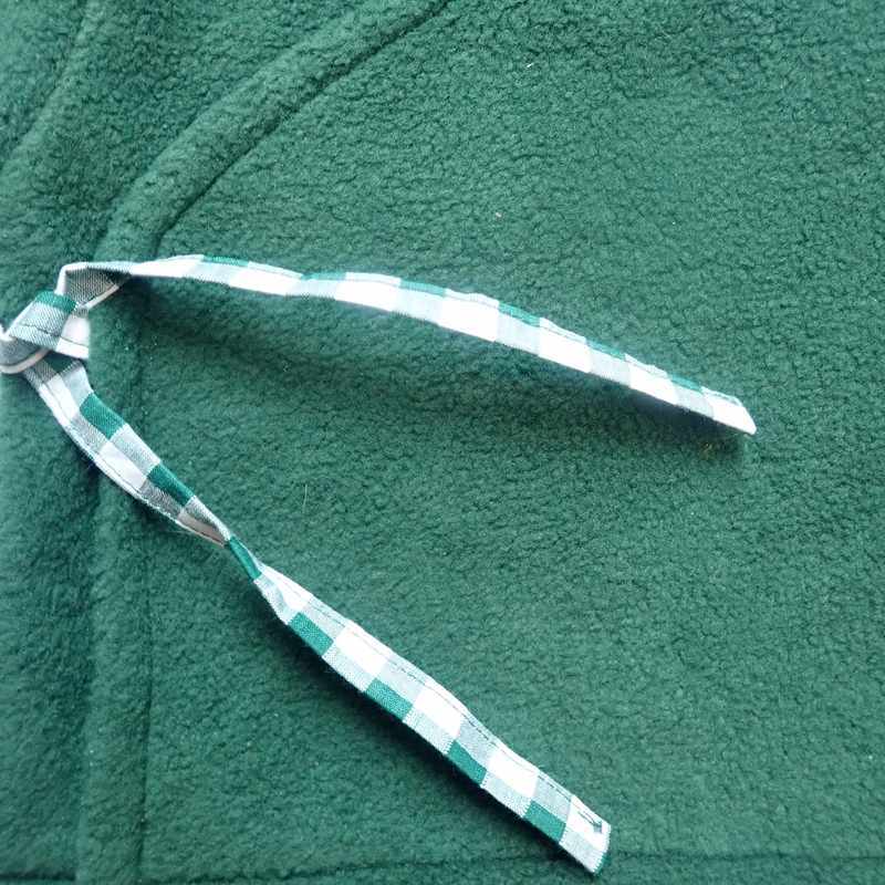 Gilet brassière polaire vert foncé qui se ferme par 2 liens qui se nouent à l’intérieur et à l’extérieur.