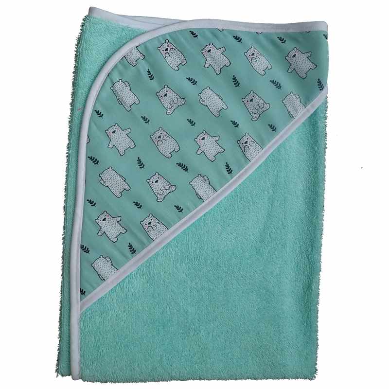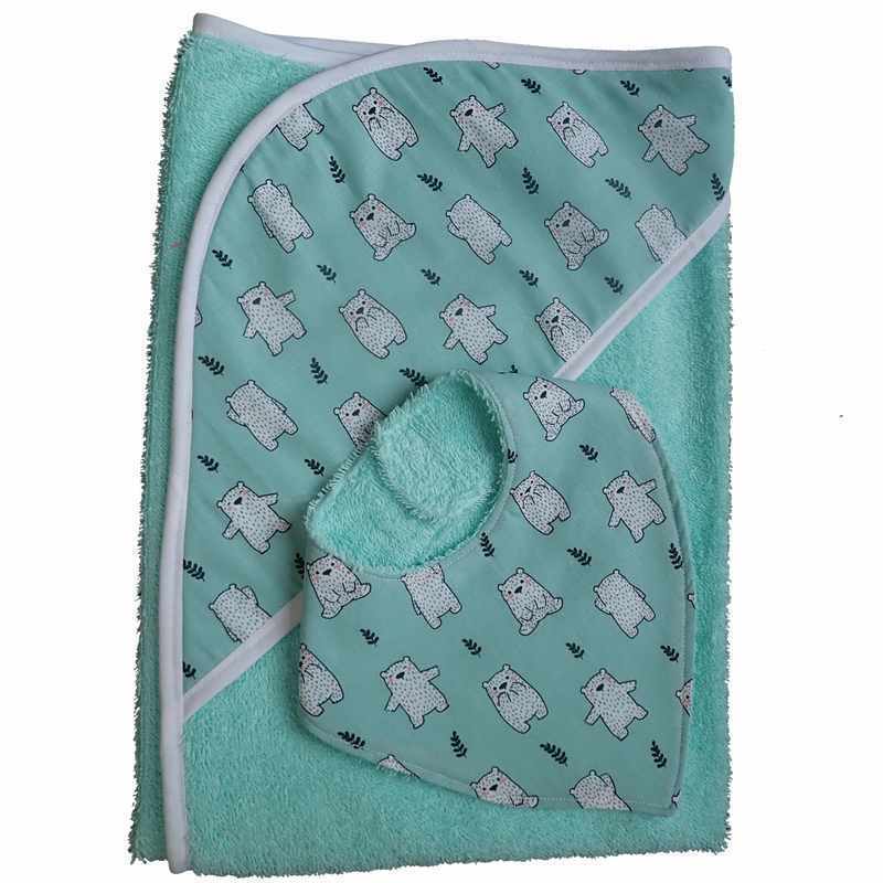 Ensemble cape de bain et bavoir bandana vert lagon en éponge de coton imprimé petits oursons et bordés par un biais blanc.