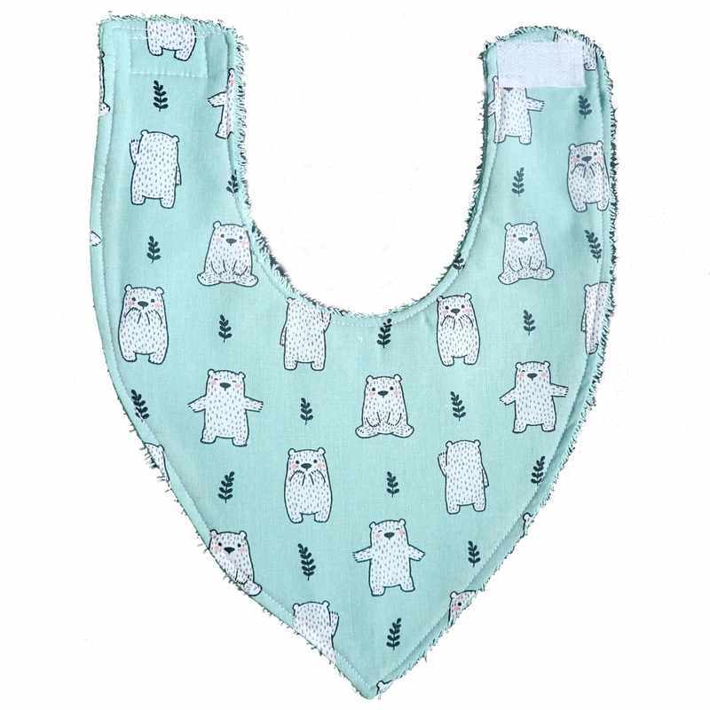 Ensemble cape de bain et bavoir bandana vert lagon en éponge de coton imprimé petits oursons et bordés par un biais blanc. Il sera parfait pour un cadeau de naissance, il est livré dans une pochette en organza.