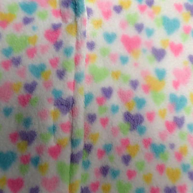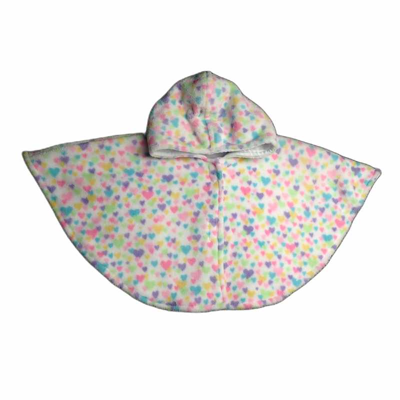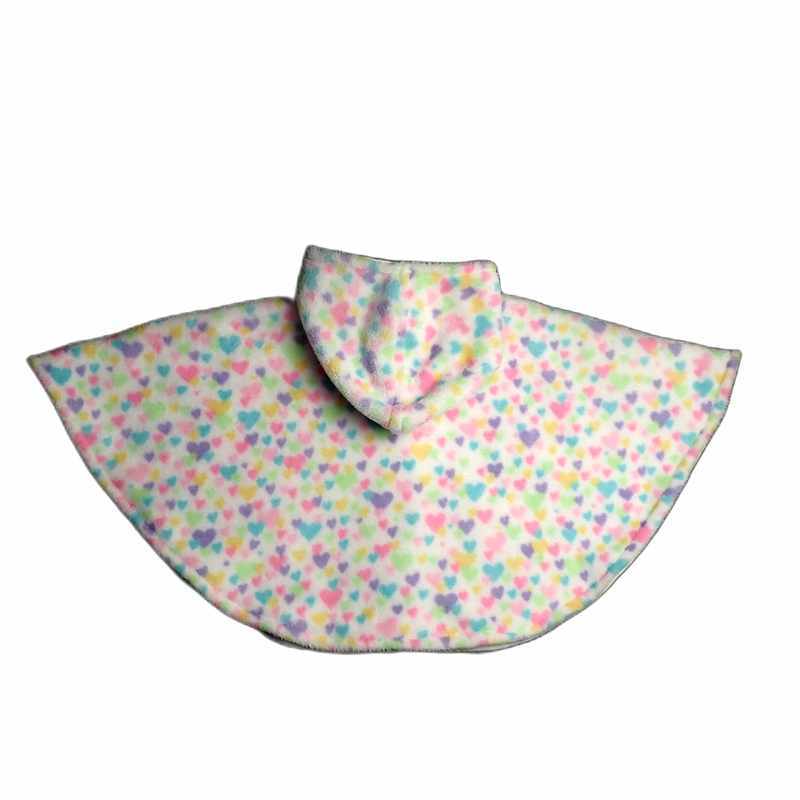 Cape poncho en polaire doudou motif petits cœurs multicolores, doublé de coton blanc extensible. Le modèle se ferme devant par deux scratchs, ce qui le rend très pratique pour les promenades de bébé, fabriqué dans un tissu dormant sur une étagère, livré dans une pochette en organza.