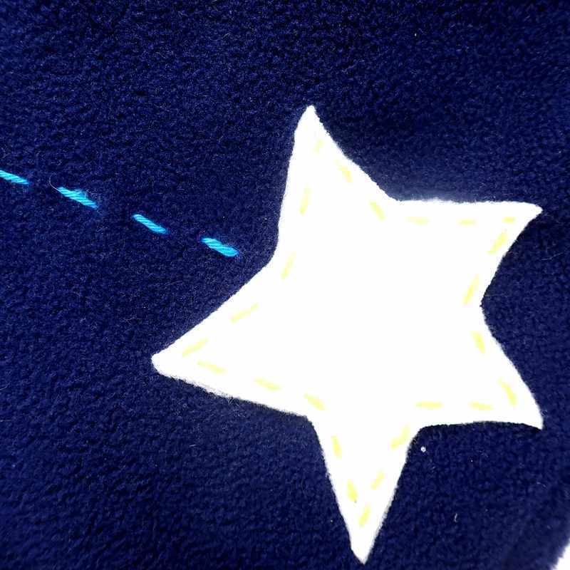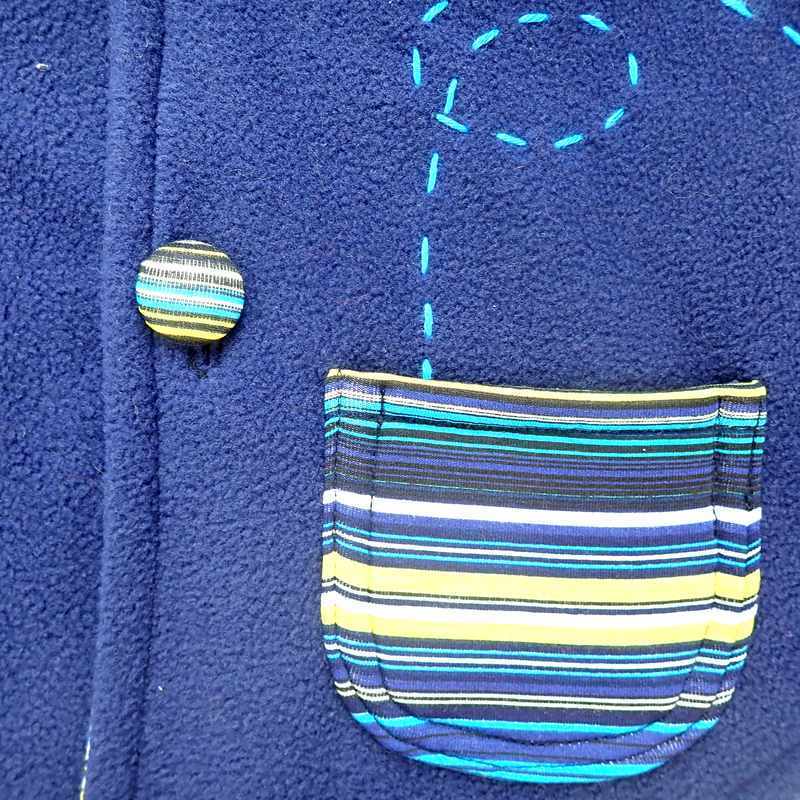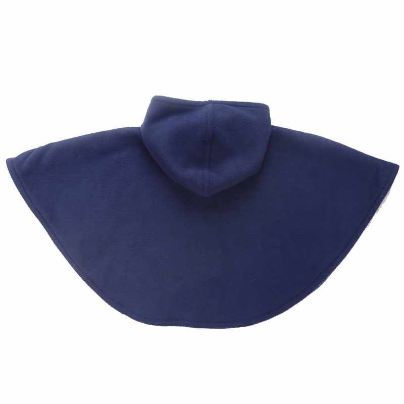 Cape poncho en polaire bleu marine avec capuche doublée de tissu extensible en coton et viscose rayé bleu, jaune et blanc, avec une poche d’où sort une étoile écrue décorée de pointillés et deux boutons recouverts du même tissu que cette poche. Le modèle est livré dans une pochette en organza.