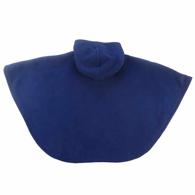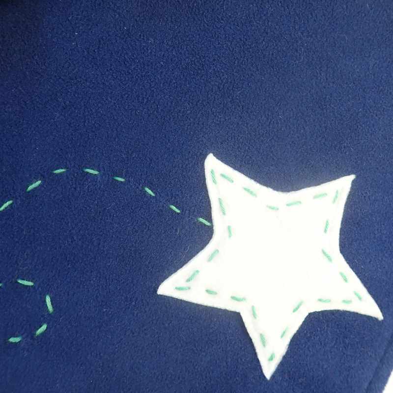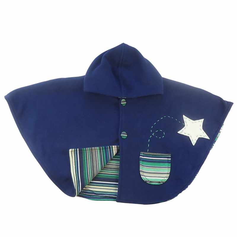 Cape poncho en polaire bleu marine avec capuche doublée de tissu extensible en coton et viscose rayé vert, bleu et écru, avec une poche d’où sort une étoile écrue décorée de pointillés et deux boutons recouverts du même tissu que cette poche. Le modèle est livré dans une pochette en organza.