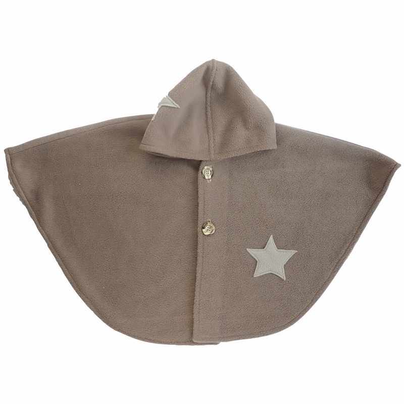 Cape poncho en polaire marron avec capuche rayée marron et gris, et deux étoiles cousues.