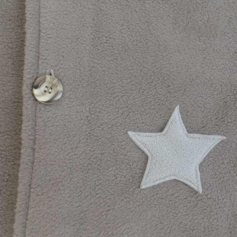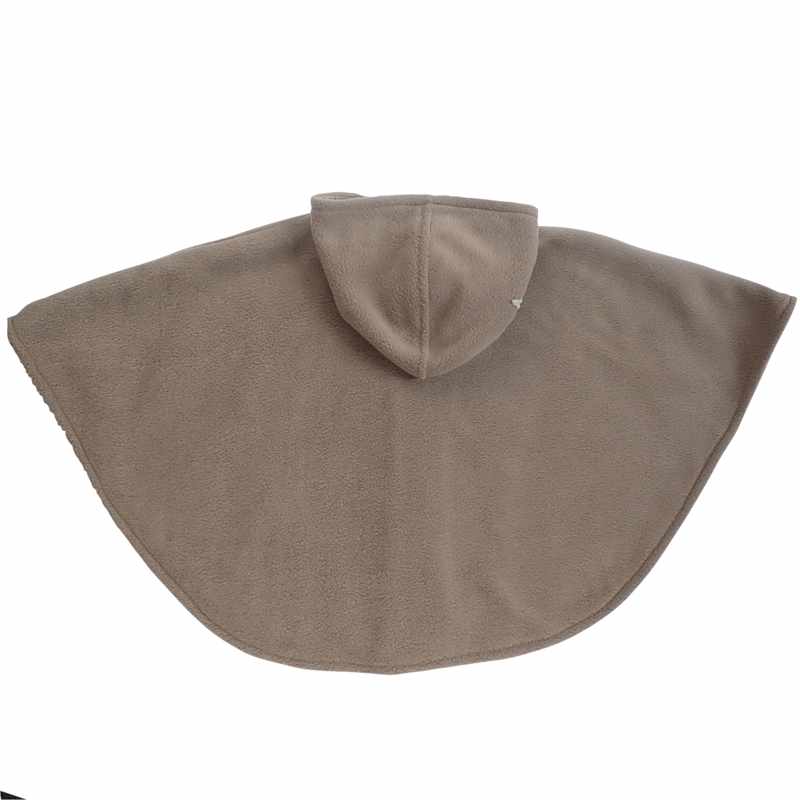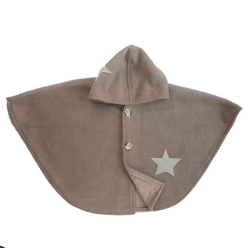 Cape poncho en polaire marron taupe avec capuche doublée de tissu extensible en viscose rayé marron et gris, avec deux étoiles grises cousues et deux gros boutons qui finissent le modèle. Il est livré dans une pochette en organza.