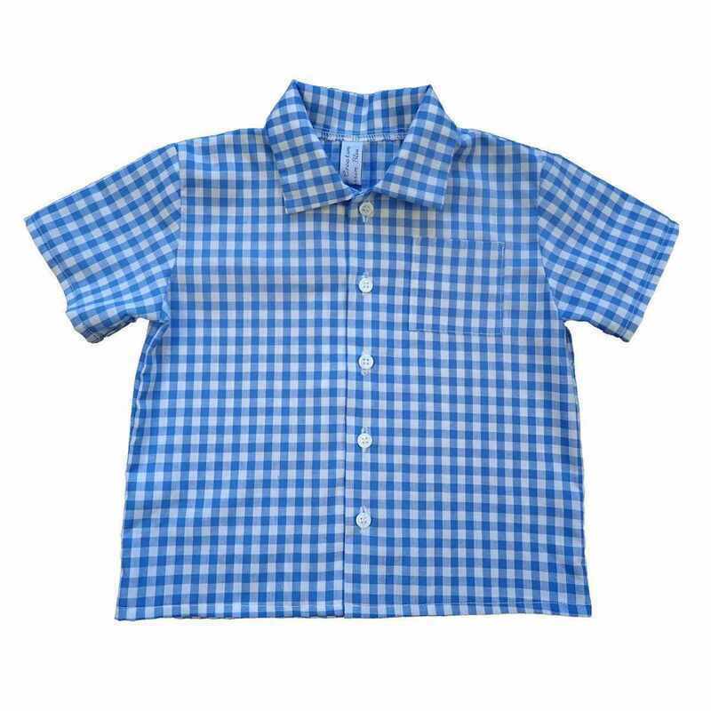 Chemise à carreaux bleu et blanc en coton avec manches courtes, un col classique, une coupe droite, une poche qui agrémente le modèle, et 5 boutons blancs qui le ferme. Elle est livrée dans une pochette en organza.