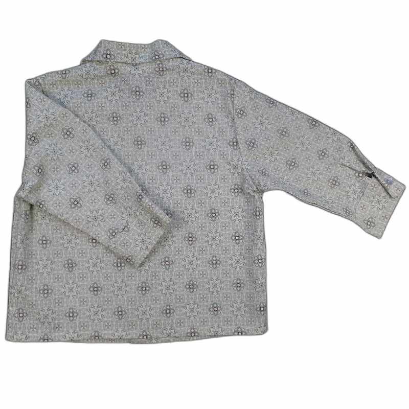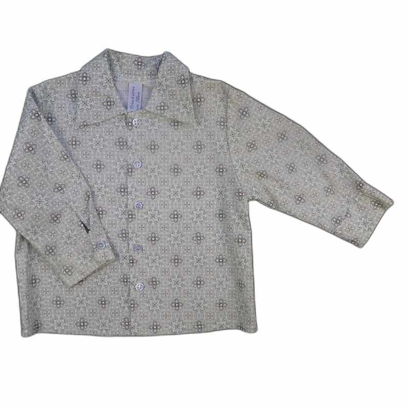 Chemise bébé manches longues en coton ivoire imprimé style carreaux de faïence gris avec un col classique, une coupe droite, se ferme par des boutons devant. Livrée dans une pochette en organza.