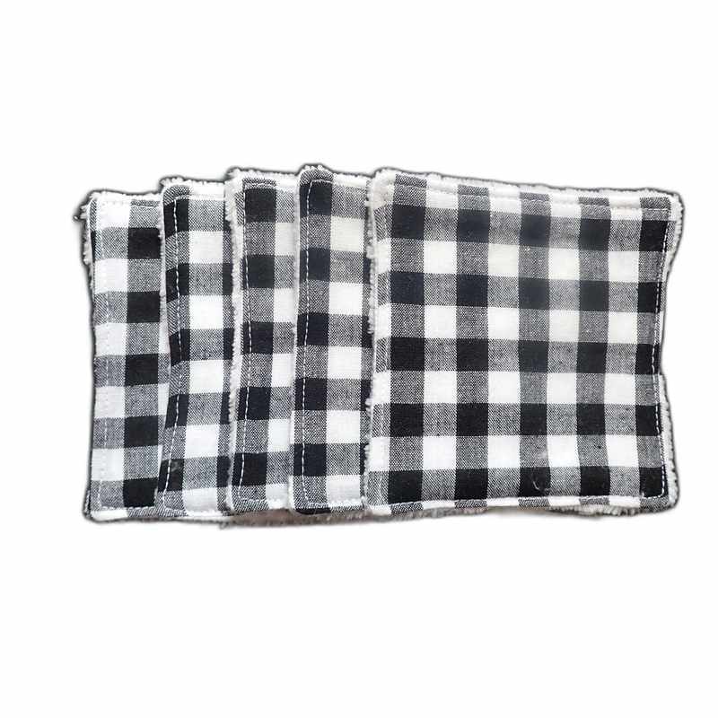 Lot de cinq lingettes lavables noires et blanches en coton à carreaux doublées d’éponge en viscose de bambou de couleur blanche.