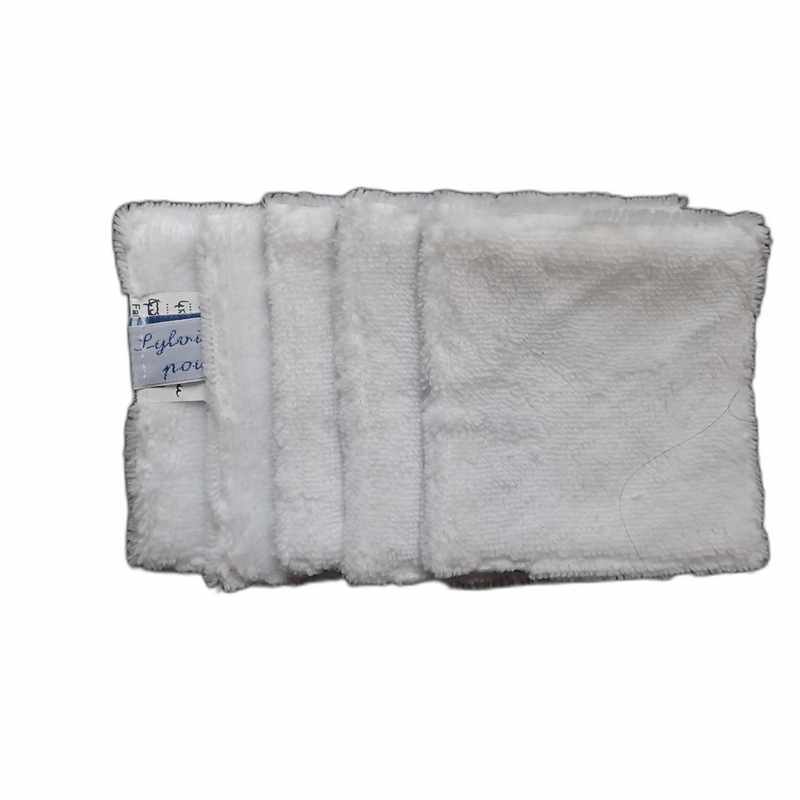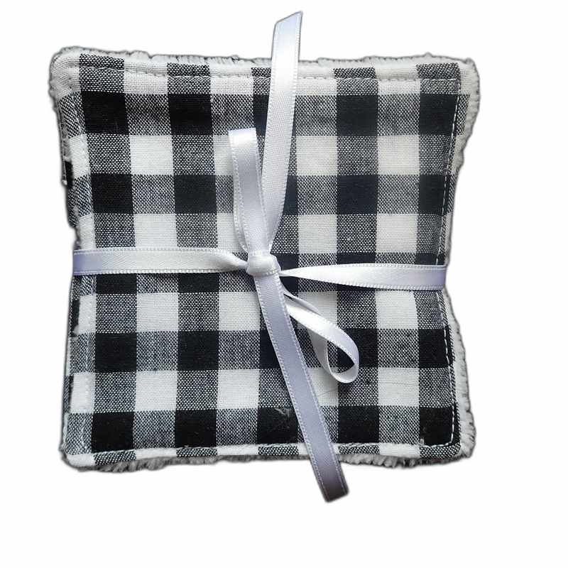 Lot de cinq lingettes noires et blanches en coton motif à carreaux, elles sont doublées d’éponge en viscose de bambou, de polyester et de coton de couleur blanche. Elles sont très douces, un ruban de satin blanc vient finir l’ensemble, livrées dans une pochette en organza.