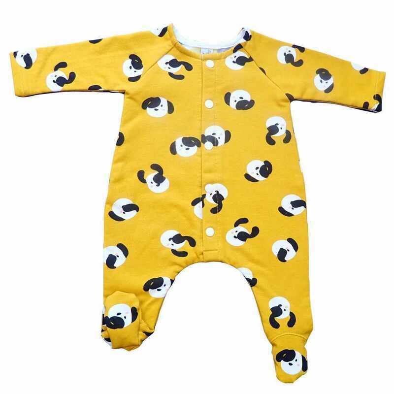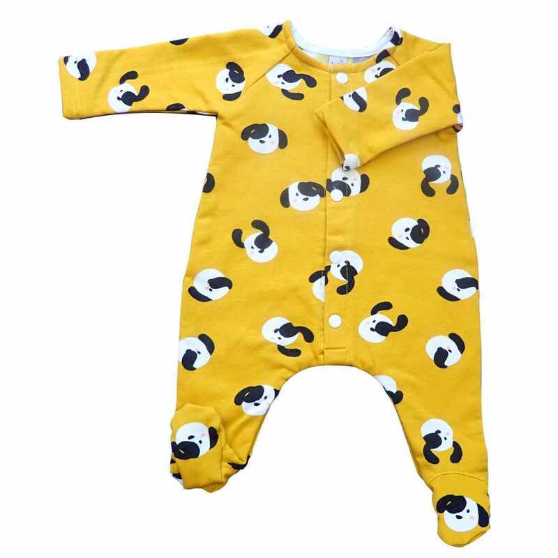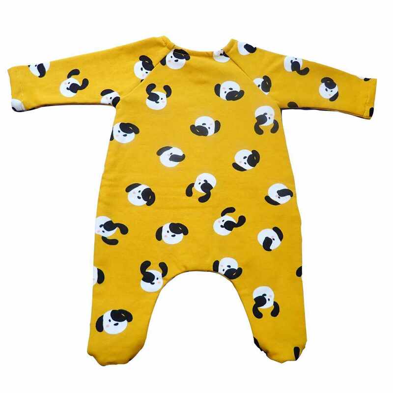 Combinaison jaune à pieds imprimée motif chien. Son ouverture par pressions jusqu’à l’entre-jambe est pratique et son toucher très doux sera agréable pour le bien-être dé bébé. Elle est livrée dans une pochette en organza.