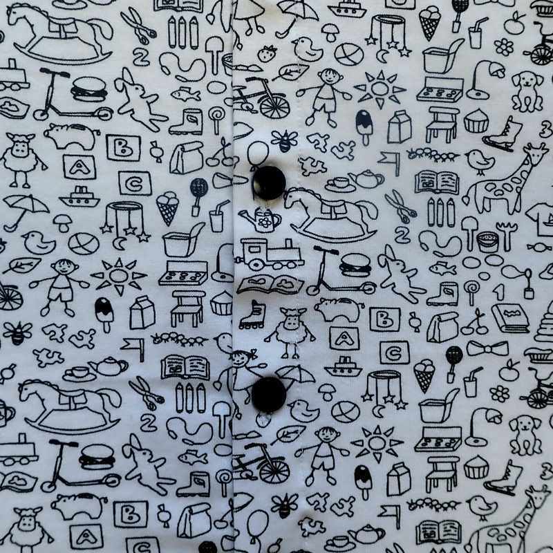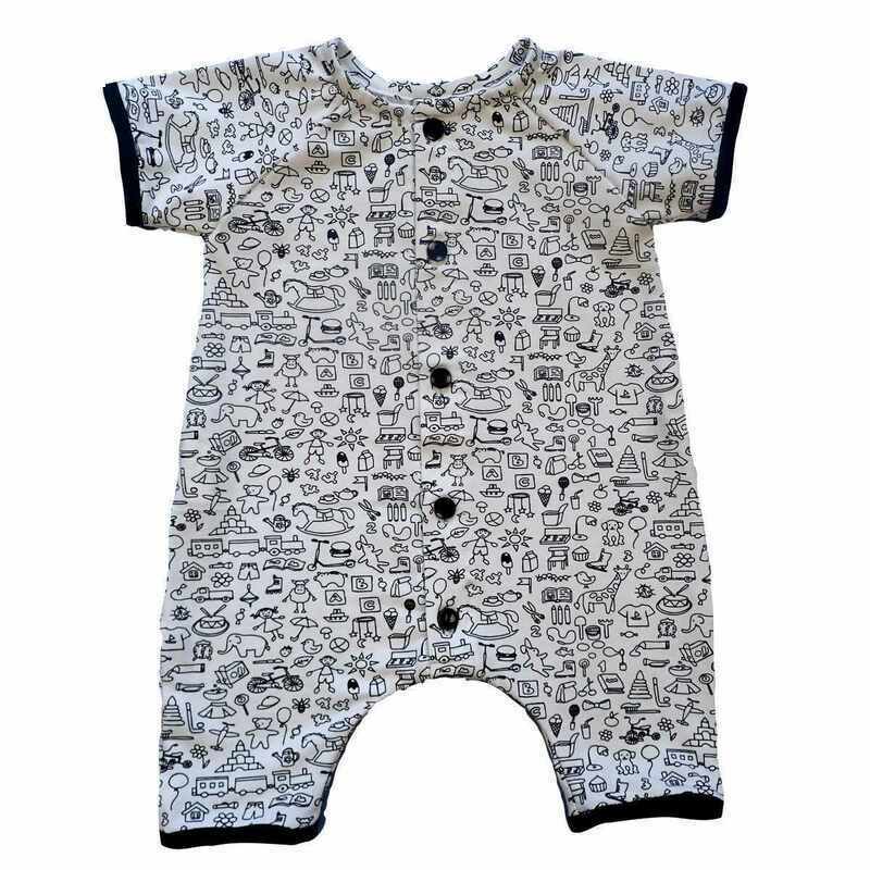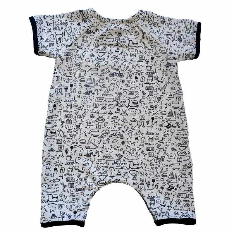 Combinaison courte en coton extensible, imprimée jouets en noir et blanc, avec un liseré noir sur les bords du vêtement. Ouverture jusqu’à l’entre-jambe finie par des boutons noirs, légère et pratique pour les beaux jours. Elle est livrée dans une pochette en organza.