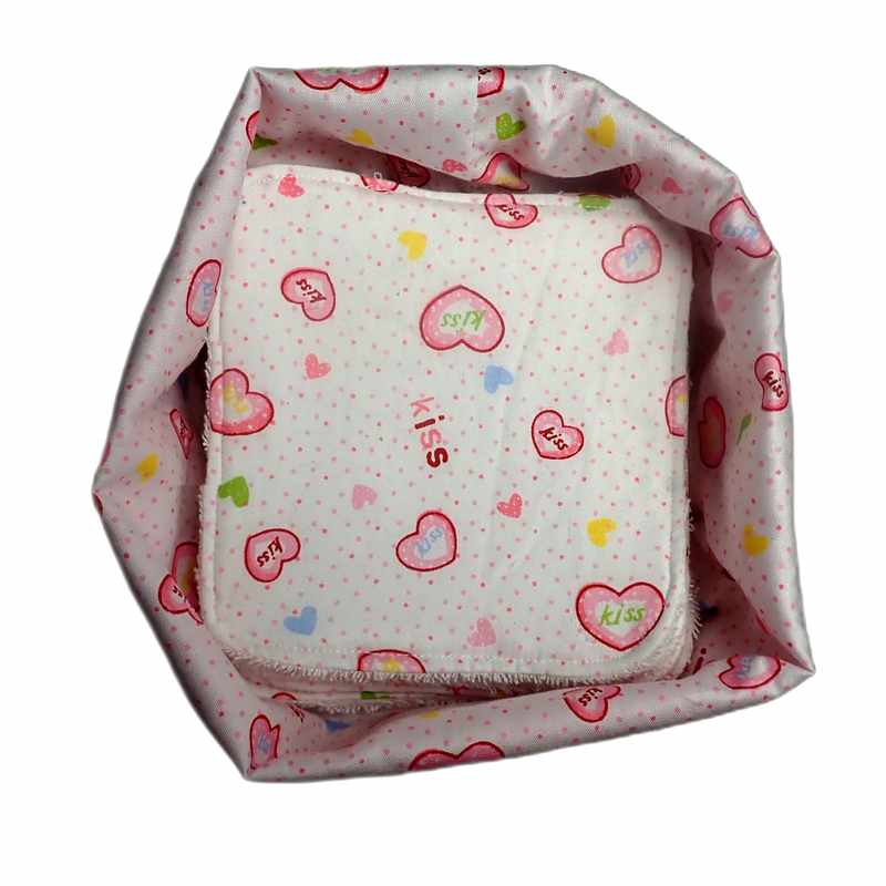 Corbeille en coton blanche et rose imprimée motif cœurs, elle est garnie de dix lingettes lavables confectionnée dans le même tissu doublées d’éponge en coton de couleur blanche. Elle est livrée dans une pochette en organza.