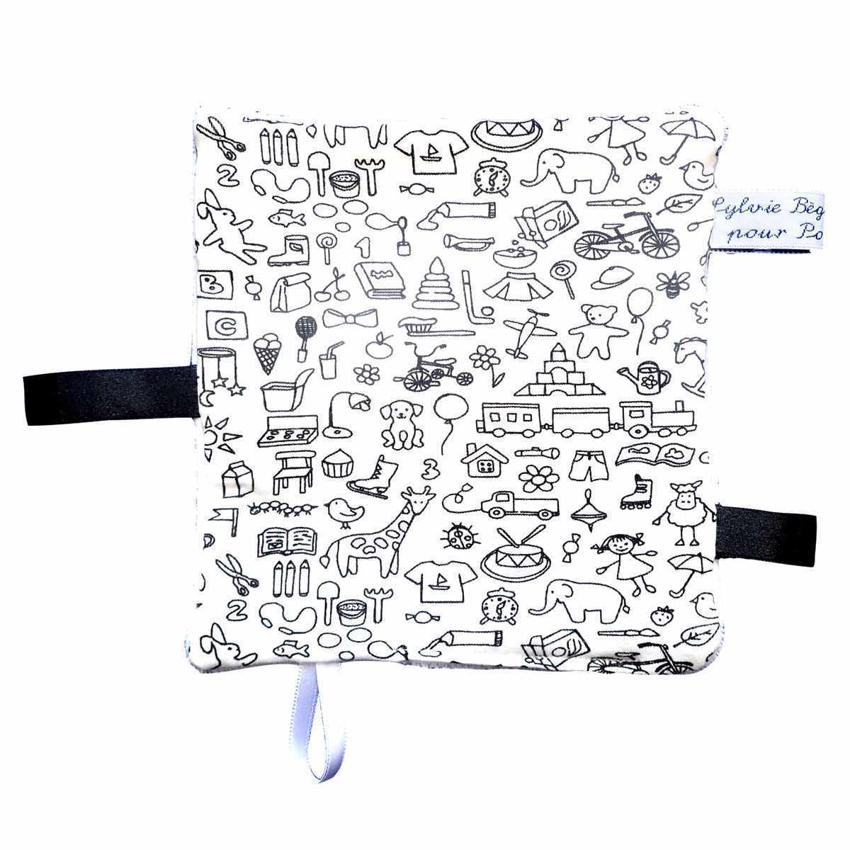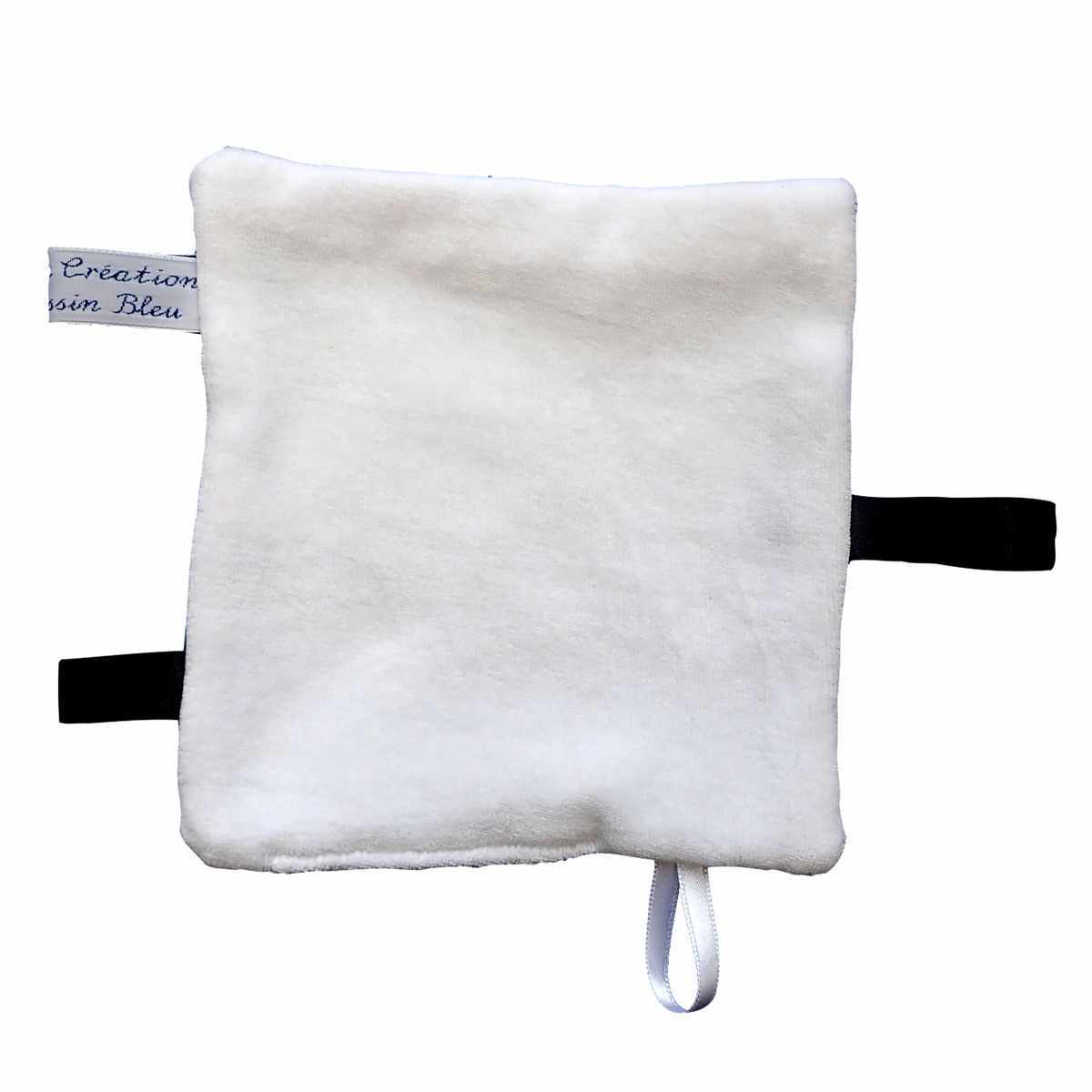 Doudou plat décoré de ruban de satin noir et blanc, avec une face imprimée motif jouets et l’autre en velours blanc. Il est livré dans une pochette en organza.