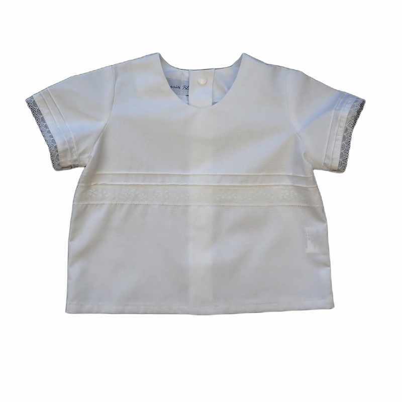 Ensemble bébé en coton blanc composé d’un pantacourt élastiqué à la taille et en bas des jambières, et d’un haut à manches courtes décoré de petits plis piqués et de dentelle. Le modèle se ferme au dos par des pressions,idéal pour une cérémonie comme un baptême, livré dans une pochette en organza.