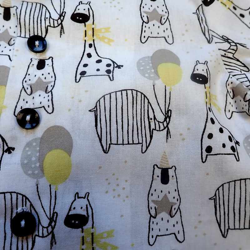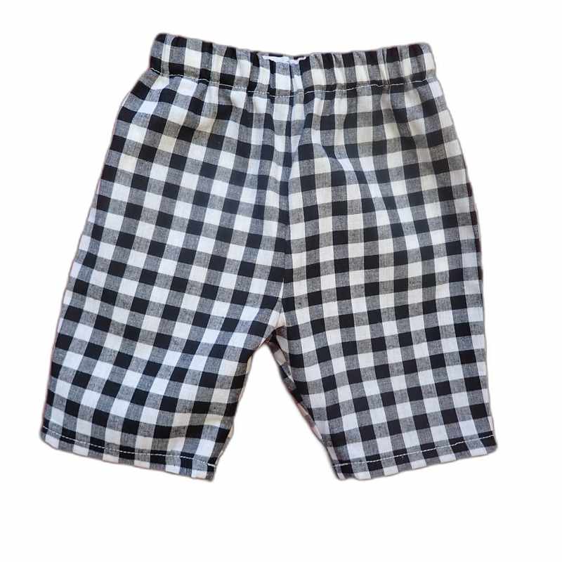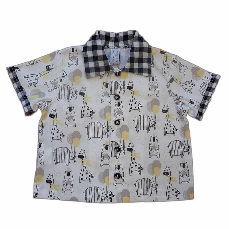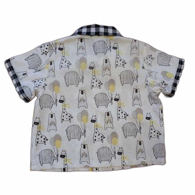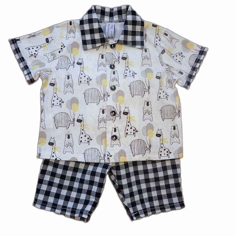 Ensemble en coton composé d’un pantacourt noir et blanc à carreaux élastiqué à la taille et d’une chemise à manches courtes imprimé motif animaux et carreaux. Le modèle a un col classique, une coupe droite et une fermeture à l’avant par des boutons Il est livré dans une pochette en organza.