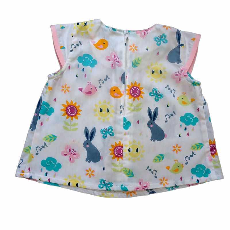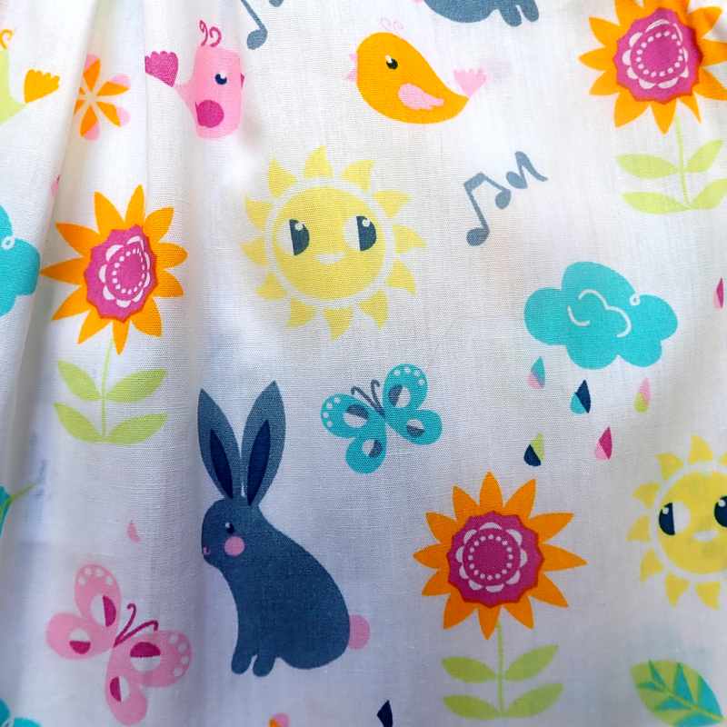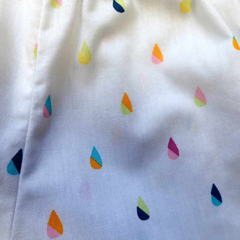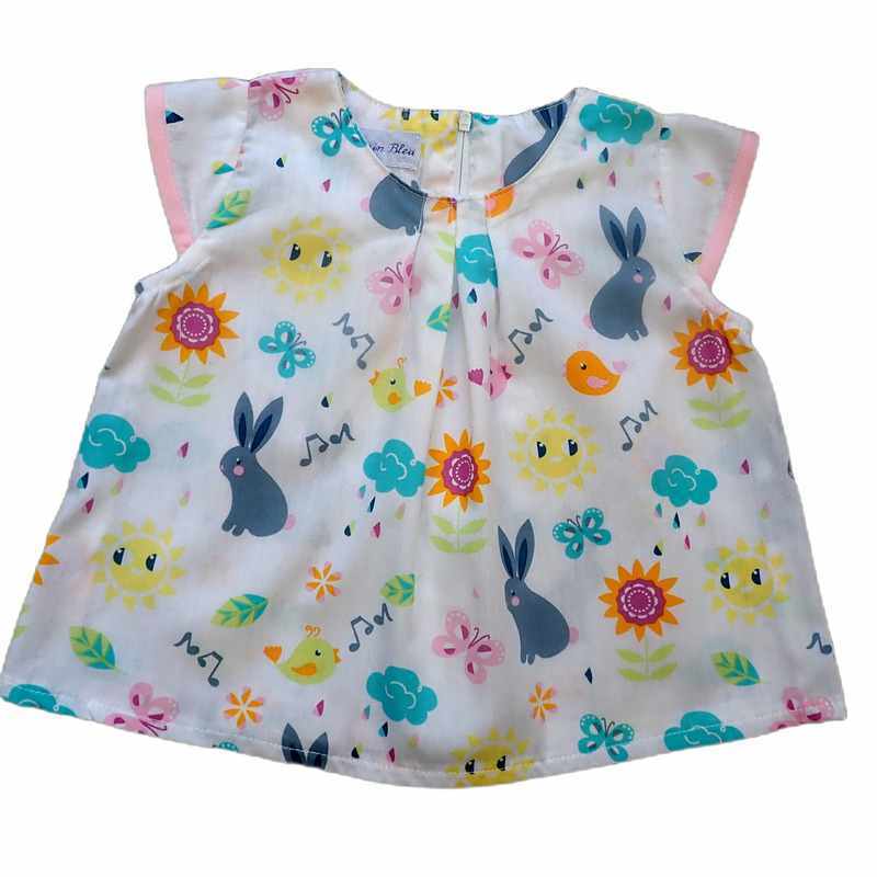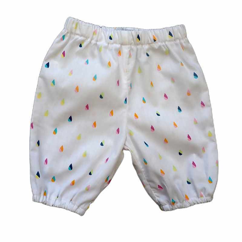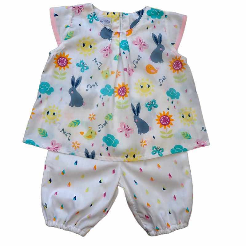 Ensemble en coton léger composé d’un pantacourt blanc motif gouttes multicolores élastiqué à la taille et au bas du modèle. Le haut qui complète le modèle est blanc imprimé de motifs lapins et soleil a une encolure ronde et des petits plis devant, les mancherons sont bordés d’un biais rose. Le modèle se ferme au dos par une fermeture, idéal pour les beaux jours, il est livré dans une pochette en organza.