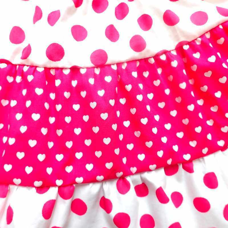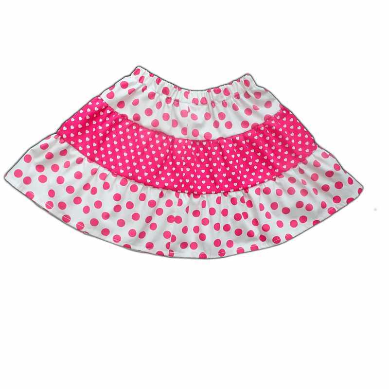 Jupe en coton rose vif et blanche motifs cœurs et pois avec une taille élastiquée et trois volants, longueur sous genoux. Le modèle est pratique, léger et élégant pour les beaux jours, livré dans une pochette en organza.