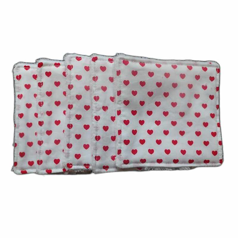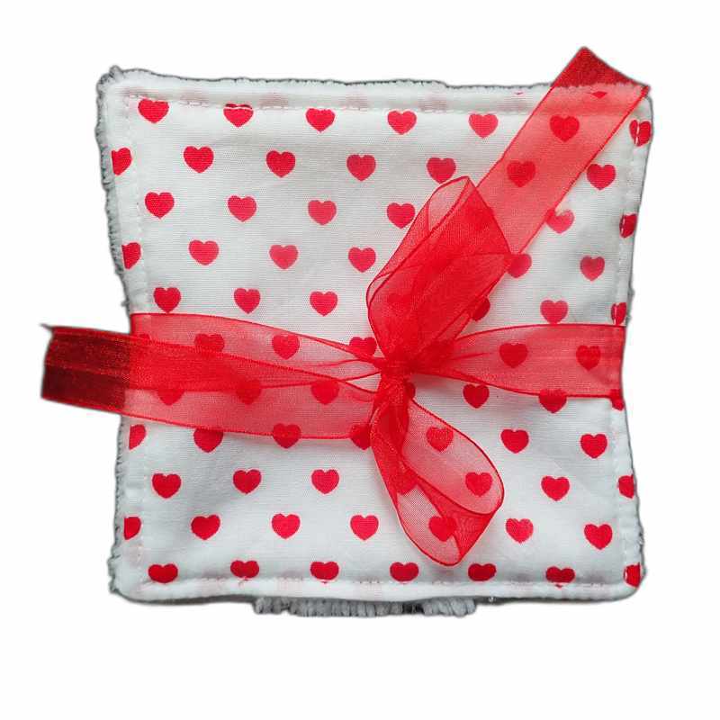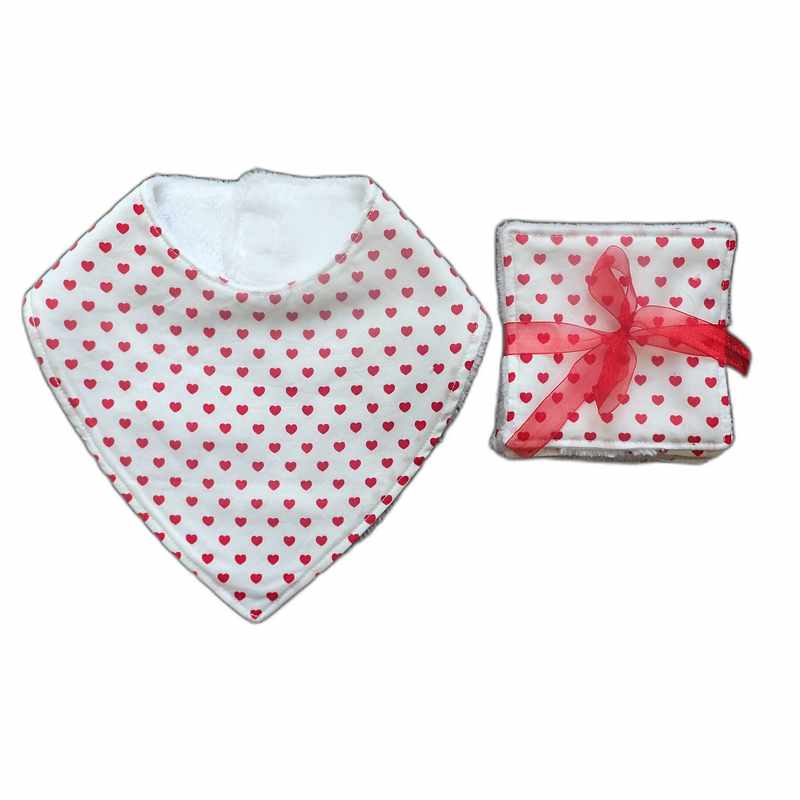 Ensemble composé d’un bavoir bandana et de cinq lingettes de couleur blanche motif cœurs rouges doublés d’éponge en bambou blanche. Parfait pour un cadeau.