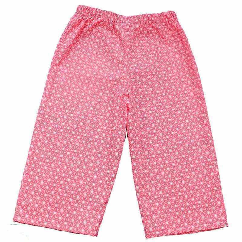 Pantacourt en coton rose imprimé motif rosaces blanches, avec taille montée sur élastique. Il sera idéal pour les beaux jours, il est livré dans une pochette en organza.