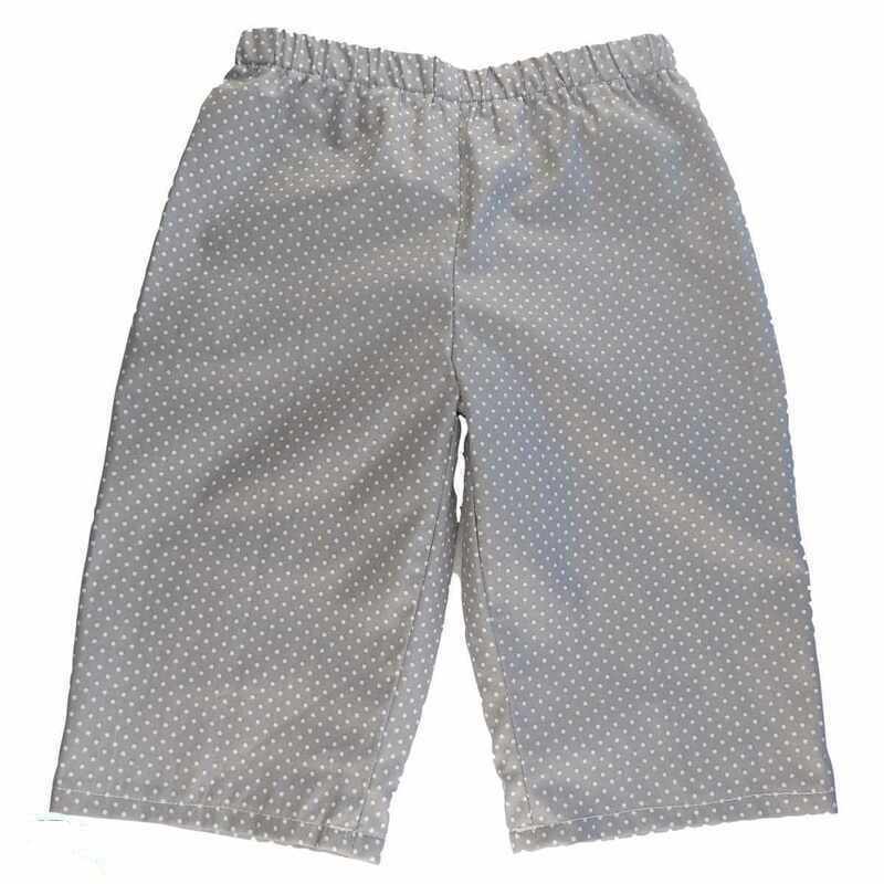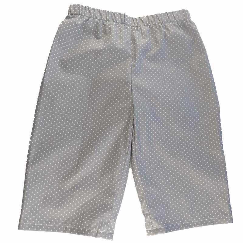 Pantacourt en coton gris imprimé motif gris à points blancs, avec taille montée sur élastique. Il est léger et confortable, donc idéal pour les beaux jours.