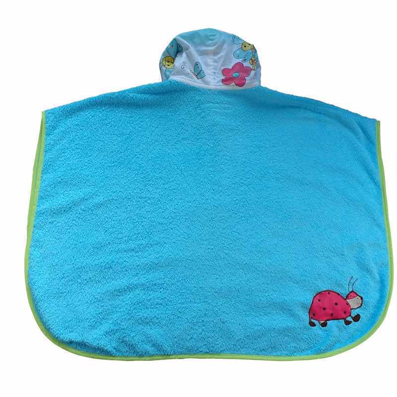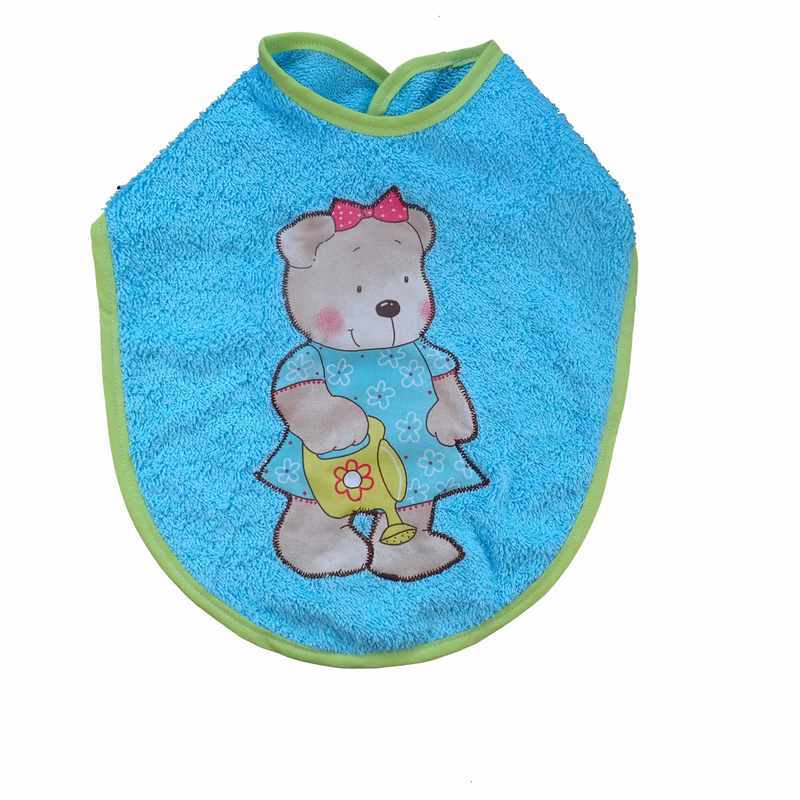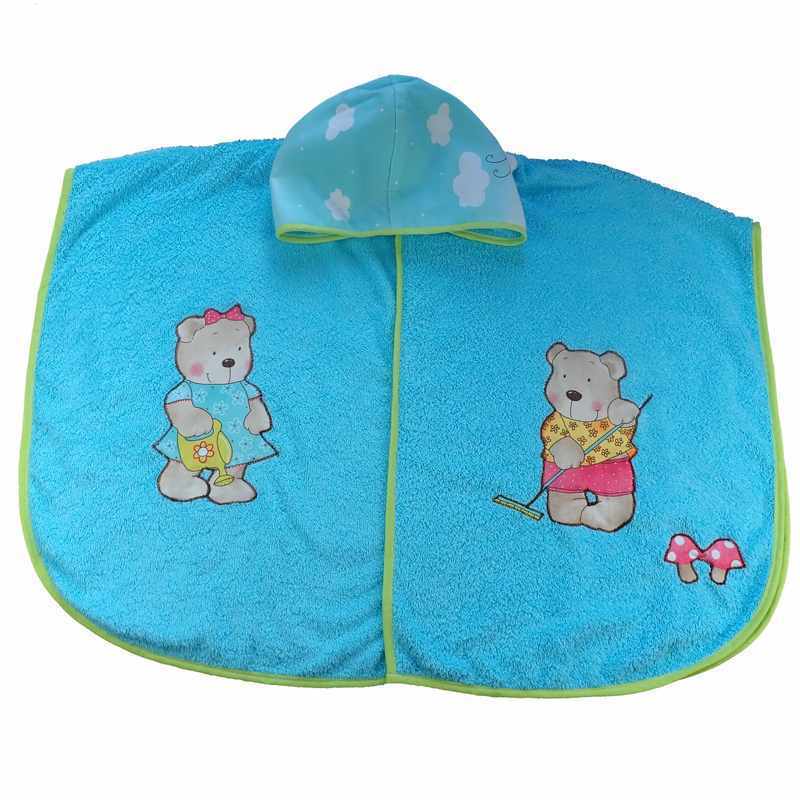 Poncho de bain en éponge de coton bleu turquoise avec capuche doublée imprimée sur le devant, une fermeture effectuée par 2 scratchs, et est bordée d’un biais vert anis. Deux bavoirs décorés d’oursons ainsi qu’un gant adulte motif coccinelle et un gant enfant motif champignons viennent compléter l’ensemble. Livrés dans une pochette en organza.