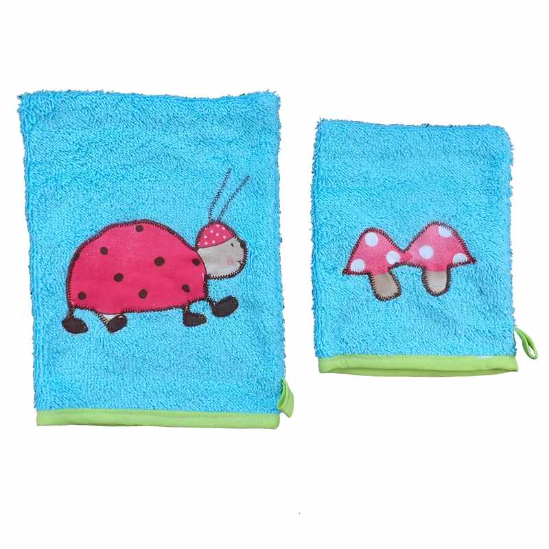 Lot comprenant un poncho de bain bleu turquoise, deux bavoirs oursons, un gant adulte coccinelle et un gant enfant champignons.