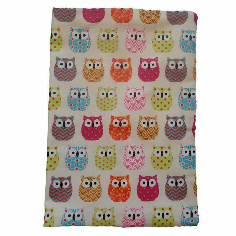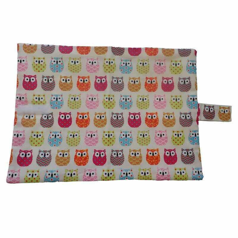 Protège carnet de santé imperméable motif hiboux multicolores sur fond écru. Fermeture par scratch doublé de coton à l’intérieur, il est livré dans une pochette en organza.