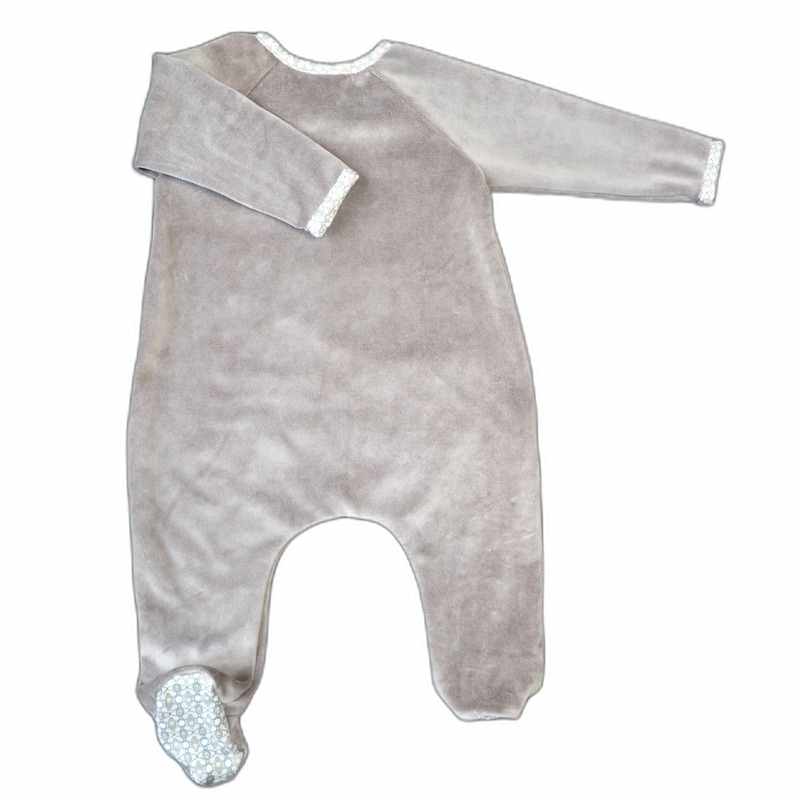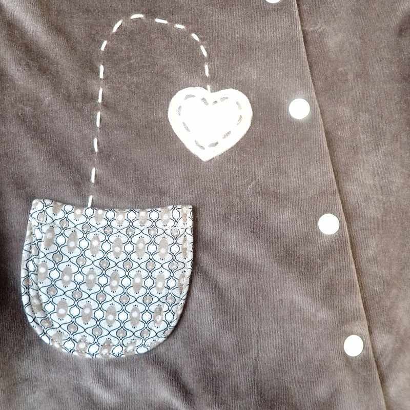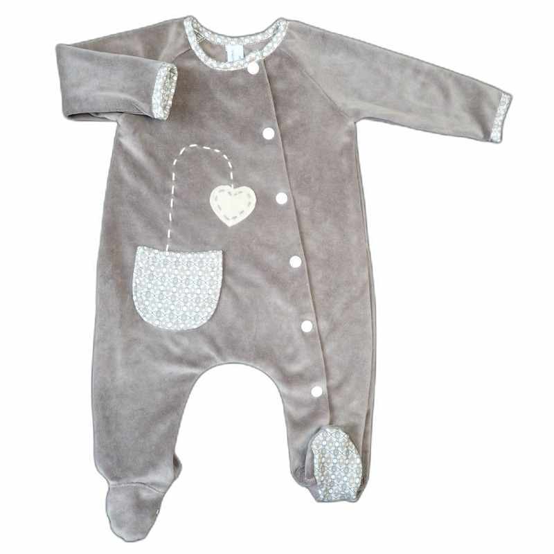 Pyjama en velours doux de couleur beige décoré d’une poche imprimée, d’un cœur et de pointillés cousus à la main. Le modèle dispose d’une ouverture complète sur le côté devant ce qui facilite l’habillage de bébé, des boutons pressions permettent la fermeture. Le tissu imprimé beige et marron borde le col et le bas des manches ainsi que le dessous du pied. Il est livré dans une pochette en organza.
