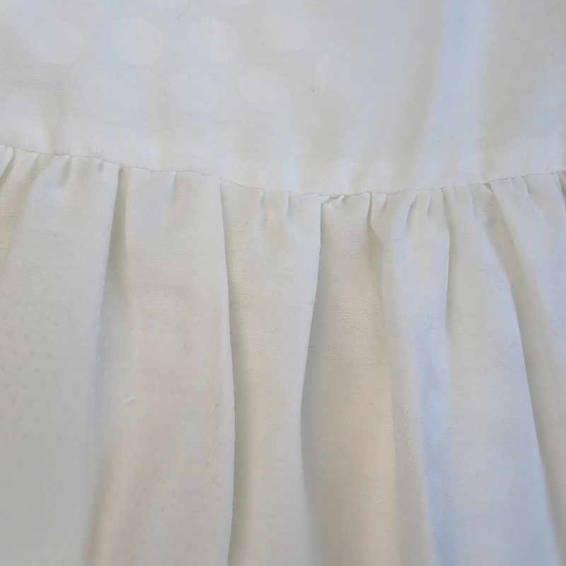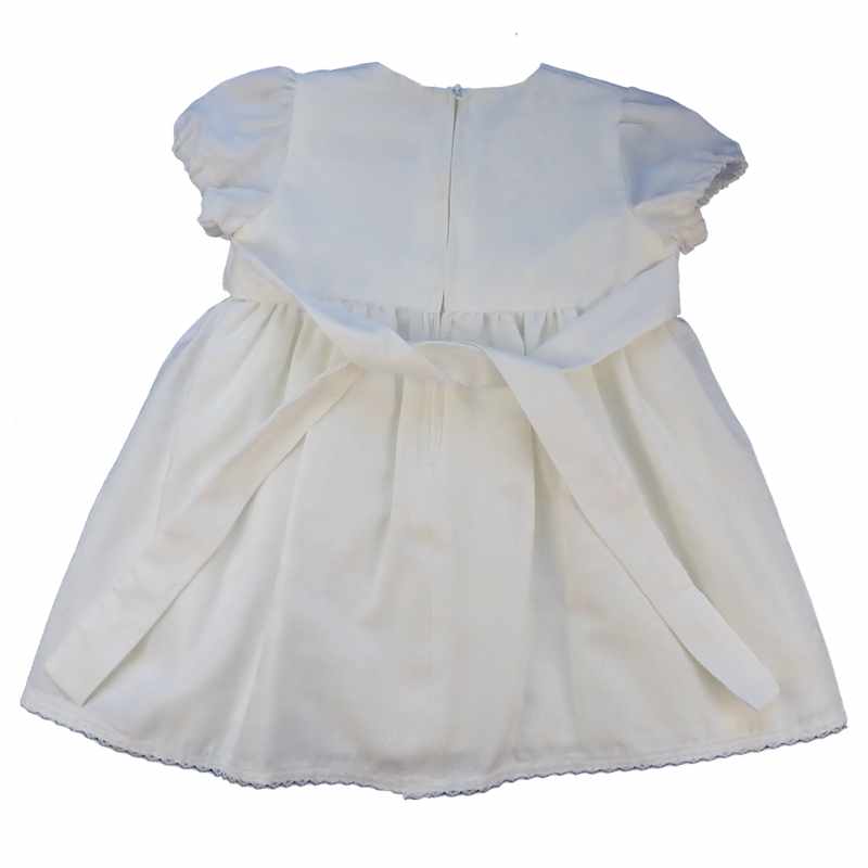 Robe couleur ivoire en tissu jacquard léger en viscose et en coton, avec une doublure en coton, deux manches courtes élastiquées, une ceinture à nouer au dos, une fermeture par zip, et une fine dentelle cousue finissant le bas de la robe. Elle est livrée dans une pochette en organza.