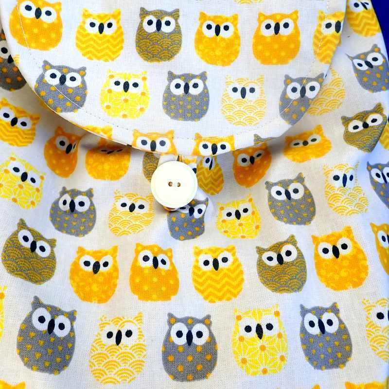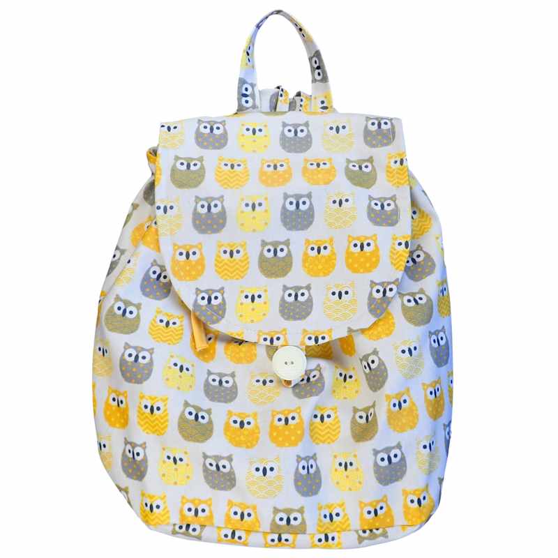 Sac à dos imperméable motif hiboux jaunes doublé de coton beige à l’intérieur resserré par un lien. Le rabat devant s’attache par une patte et un bouton. Les bretelles sont réglables grâce à des scratchs. livré dans une pochette en organza.