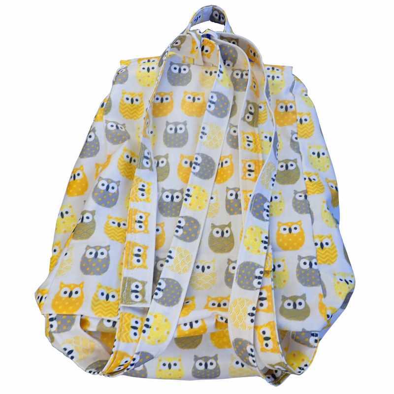 Sac à dos imperméable motif hiboux doublé de coton beige, avec des bretelles réglables et un rabat à l’avant.