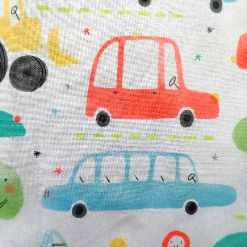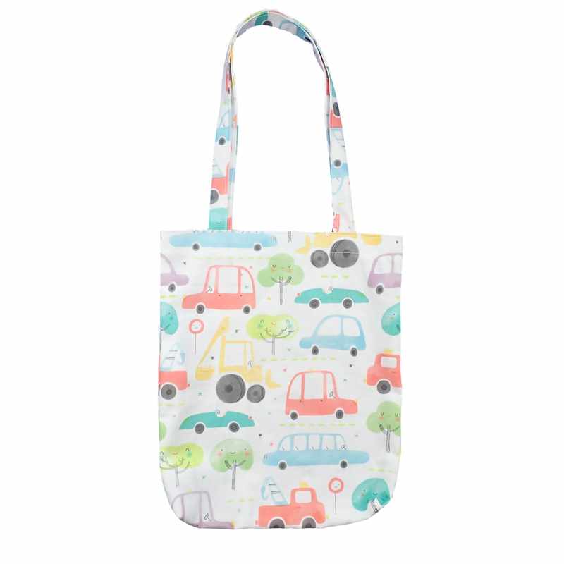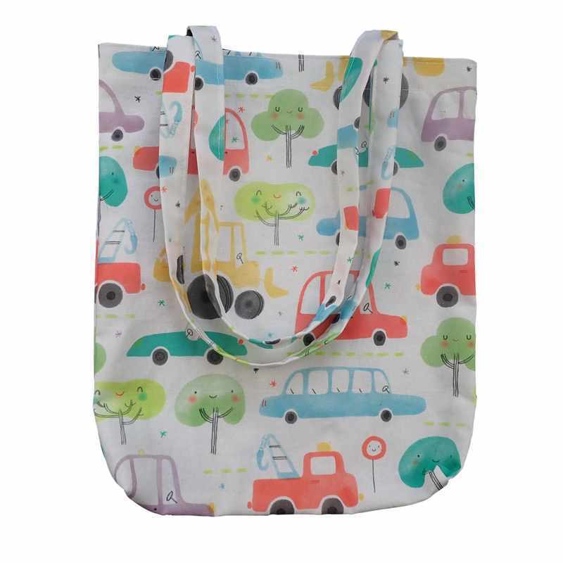 Sac en coton imprimé motif voitures et camions multicolores sur fond blanc. Joli et pratique pour votre enfant, livré dans une pochette en organza.