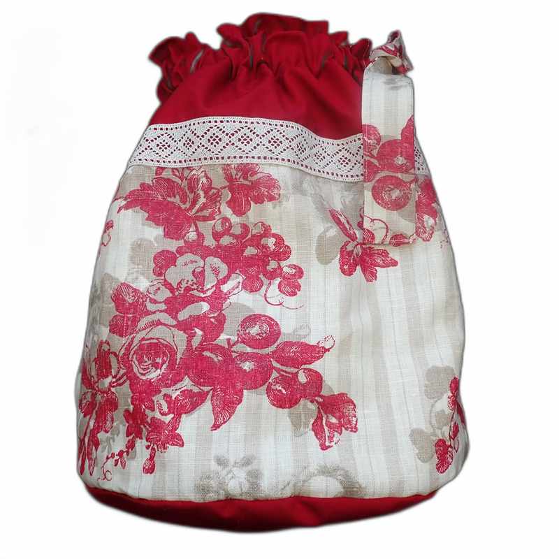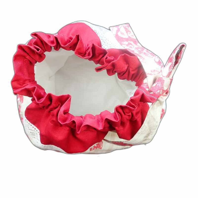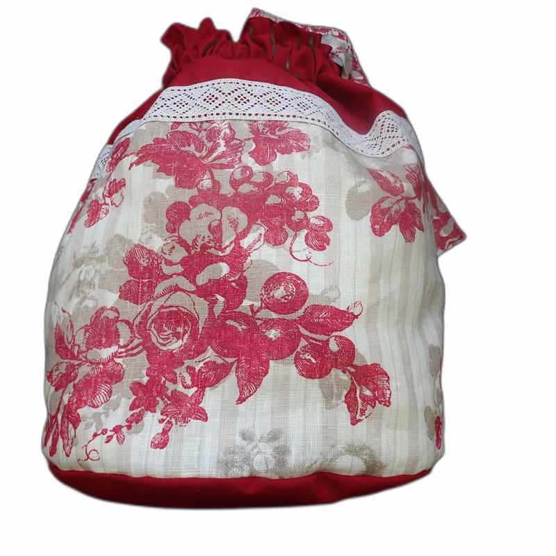 Sac de rangement ouatiné en coton et lin motif anges et fleurs décoré d’une dentelle. Le modèle se ferme par un lien du même imprimé, il sera idéal pour ranger les jouets de bébé et ses affaires. Vous pouvez assortir le sac à la gigoteuse et à l’ensemble de bain réalisé dans les tissus identiques.